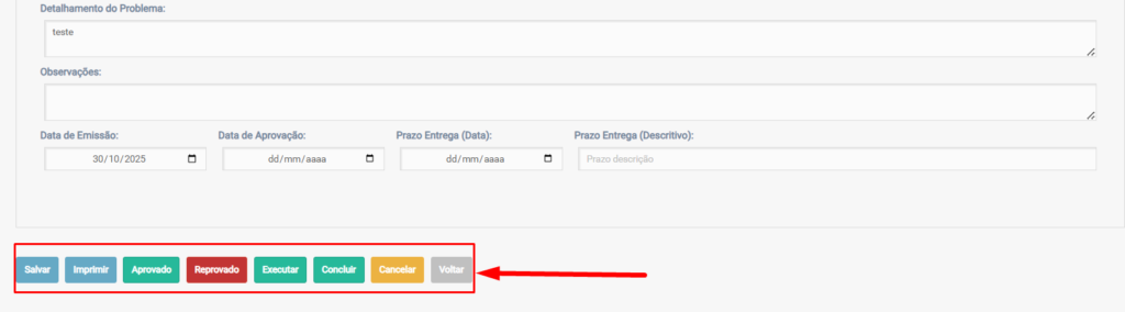 • Salvar, Imprimir, Aprovar, Reprovar, Executar, Concluir, Cancelar ou Voltar.